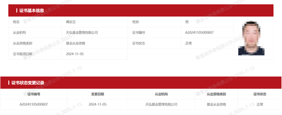 图2:天弘基金董事长黄辰立基金从业信息